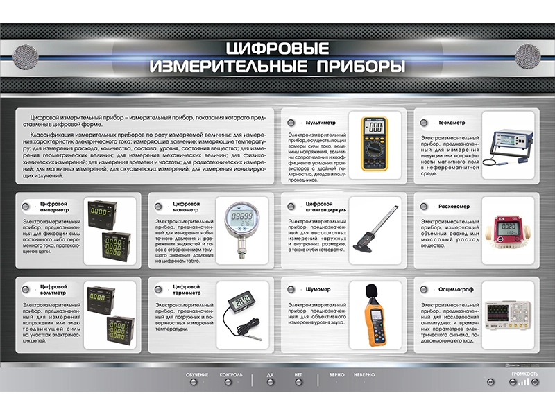 Электрифицированный стенд "Цифровые измерительные приборы" представляет собой полноцветную светодинамическую панель, на которой отображена информация о разновидностях и классификации цифровых измерительных приборов. В конструкцию учебного оборудования интегрированы высокочувствительные сенсоры для управления стендом при помощи интерактивного воздействия приемо-передающих устройств. Предусмотрено два режима работы со стендом: "Обучение" и "Контроль".