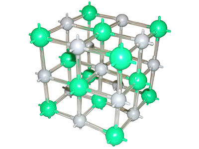 Модель предназначена для демонстрации строения элементарной ячейки кристаллической решетки каменной соли (NaCl).