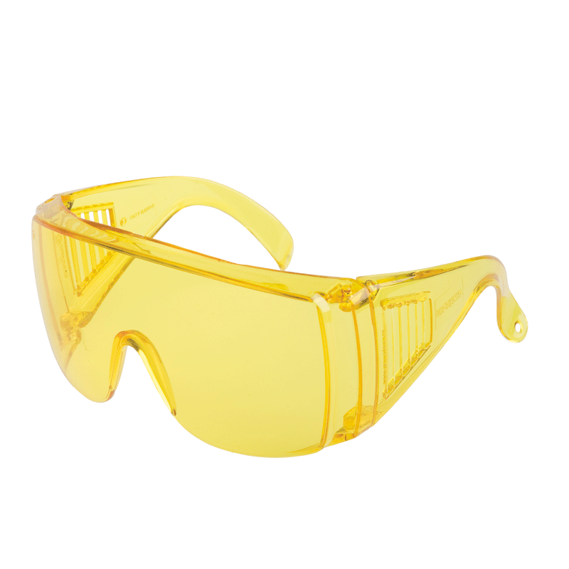 Очки с расширенным панорамным обзором для защиты от высокоскоростных летящих частиц с низким уровнем кинетической энергии и УФ-излучения. Имеют увеличенную боковую и верхнюю защиту. Очки имеют дужки анатомической формы с вентиляционными прорезями. Желтая линза предназначена для работы в условиях недостаточной освещенности (пыль, туман), увеличивает контрастность изображения, не искажая его.