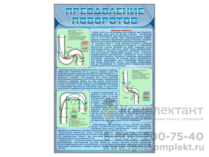 Стенды предназначены для ознакомления обучающихся со схемами одиночных и двойных поворотов на трассе, правилами их преодоления, а также для формирования осознанного отношения к занятиям картингом.