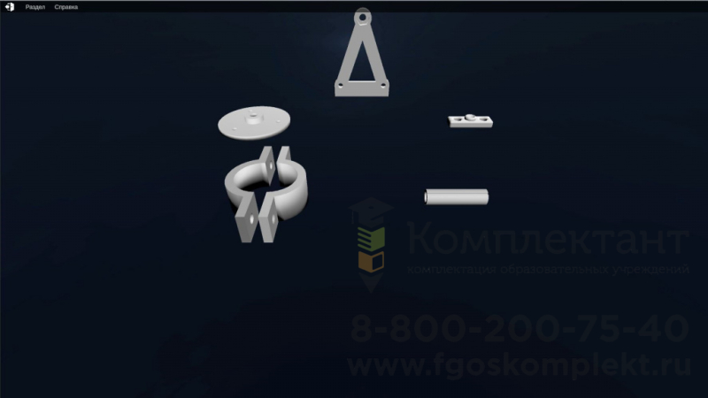 В демонстрационной среде представлены селектор (набор объектов) с пятью моделями фиксаторов крепления и комната с определенными типами материалов (кирпич, бетон, гипсокартон, ДСП, оконные рамы, трубы отопления) для предоставления информации о монтаже фиксатора крепления конкретной модели к определенному материалу.