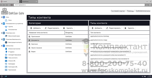 - создание и изменение правил для фильтрации контента. Заданные правила дают разрешение или запрет на определенный тип контента, передаваемый заданными способами;